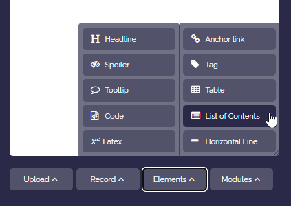 To do this, open the box editor, click “More”, then “Layout”, and select “List of contents”.