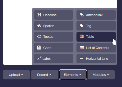 You can insert a table template via the box editor. Click “Elements” and then “Table”.