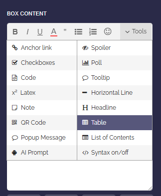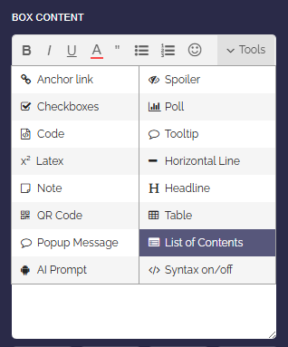 To do this, open the box editor and select the “Table of contents” option under “Tools”.
