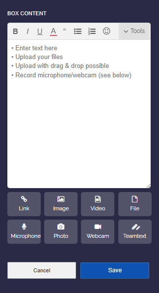 If you want to leave a message for your students, you can activate your microphone directly in the Box Editor using the "Microphone" button.