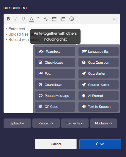 To create a teamtext document, simply click on “Add Box” or edit an existing box (by clicking on the orange pencil icon).