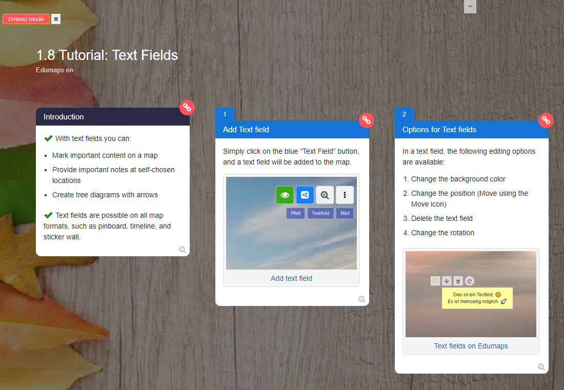 In the map view, you can recognize the active embedding mode by the red-white link symbols on the boxes as well as the small red banner “Embedding Mode” at the top left.