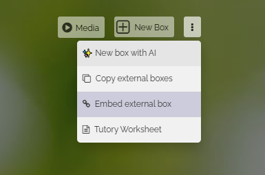 To embed an external box from another map, click on the three dots to the right of the "New Box" button. A dropdown will then open. Select "Embed External Box" from there.