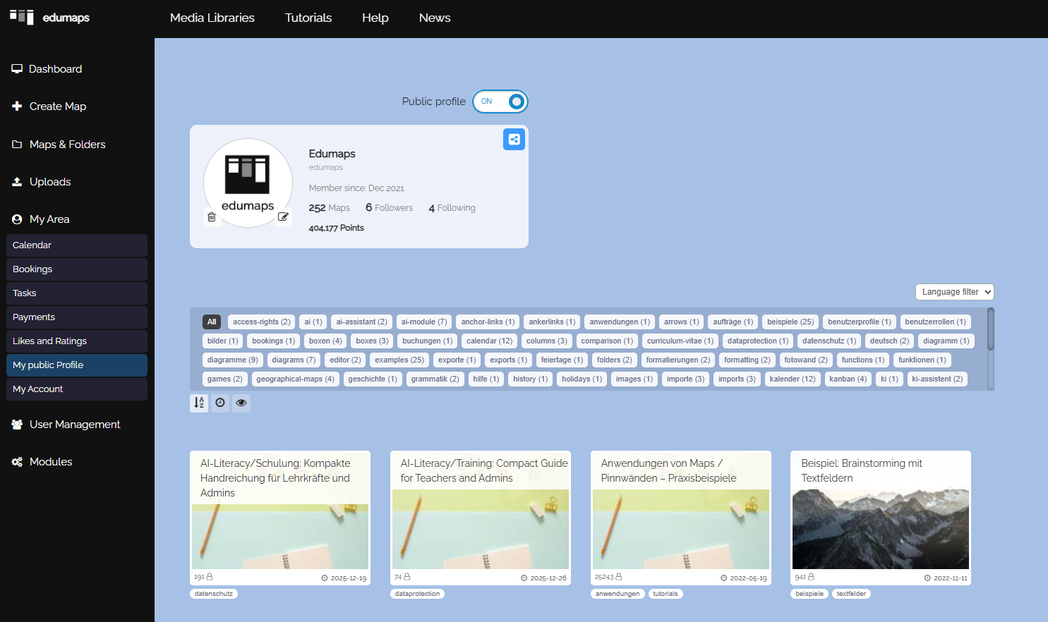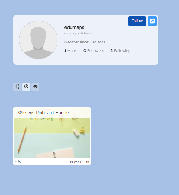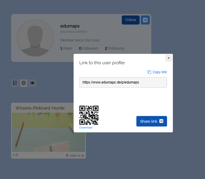 www.edumaps.de/p/username(where "username" is your Edumaps username). - You can also find the link to your public user profile on the page My Account.