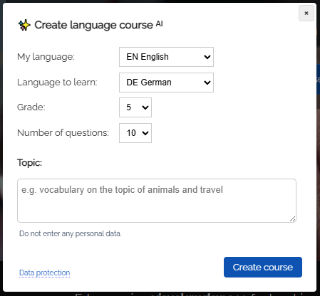 Automatically creating the language course takes about 30 seconds, depending on the topic and number of questions.