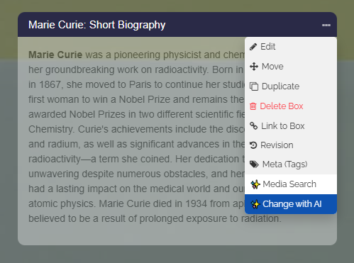 - You can rewrite the box content (for example, adjust the level) by opening the box menu and selecting "✨ Change with AI" from the dropdown.