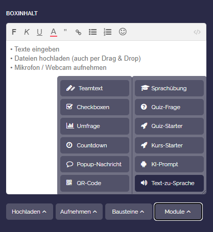 Erstellen Sie zuerst eine neue Box und wählen Sie das Text-zu-Sprache-Modul.