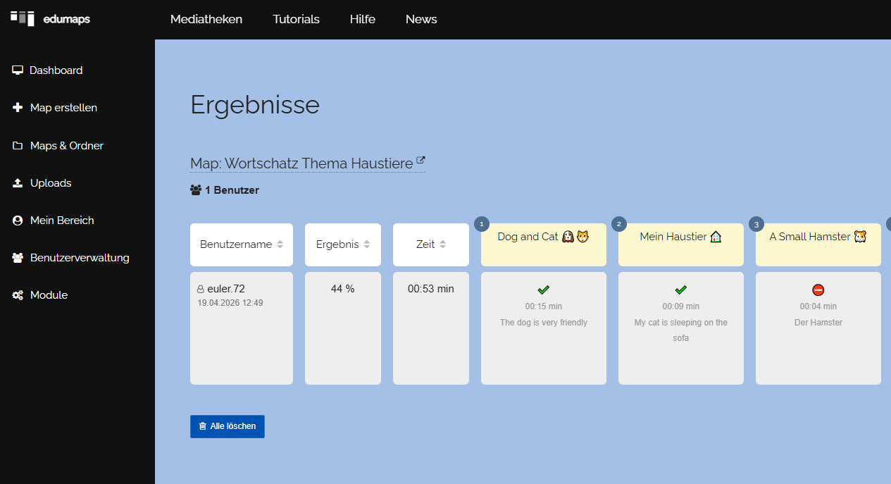 Klicken Sie in der ersten Box auf „Ergebnisse“, so können Sie alle Ergebnisse Ihrer Schüler anschauen.