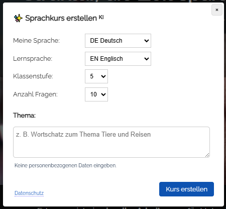 Der Dialog „Sprachkurs mit KI erstellen“ öffnet sich.