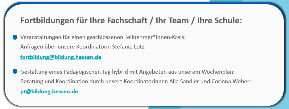 Nutzen Sie das Fortbildungsangebot der Hessischen Lehrkräfteakademie (fortbildung@bildung.hessen.de), eine Buchung einzelner Angebote für einen geschlossenenen Teilnehmer_innenkreis ist möglich.