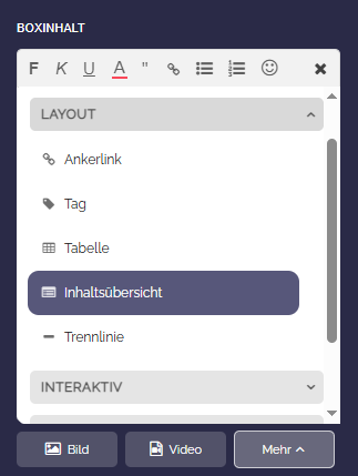 Hierzu öffnen Sie den Boxeditor, klicken auf „Mehr“, dann „Layout“ und wählen „Inhaltsübersicht“.