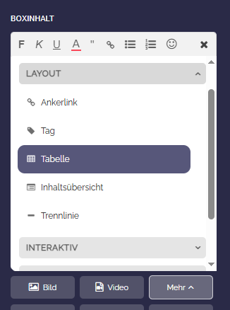 Eine Vorlage einer Tabelle können Sie über den Boxeditor einsetzen. Klicken Sie auf „Mehr“, wählen „Layout“ und dann „Tabelle“.