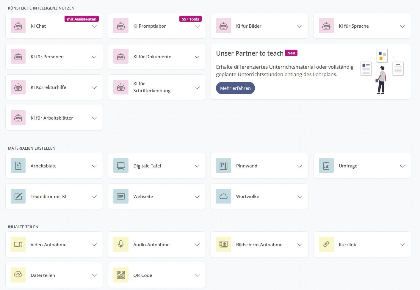 - Fobizz, Fiete.ai, LEB-Online u./o. andere KI-Tools als Landeslizenz ausrollen, z.B. wie Mecklenburg-Vorpommern oder Rheinland-Pfalz, Sachsen-Anhalt