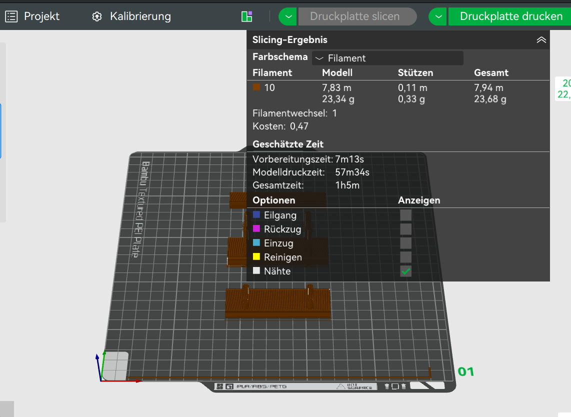 Unser Drucker ist ein Bambu-Lab P1S. Die Parameter können wie unten gezeigt eingegeben werden.
