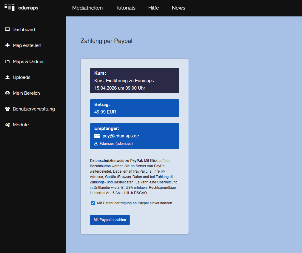 Sie haben die Möglichkeit, einen Preis für Ihren Kurs festzulegen und direkt das Geld per Paypal von Ihren Teilnehmern zu erhalten.
