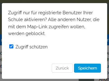 - Sie können einstellen, dass nur Benutzer, die Ihrer Schule angehören (durch den Schuladmin einsehbar in der „Liste aller Accounts“) Ihre Map öffnen dürfen. Anderen Benutzern ist damit kein Zugriff möglich.