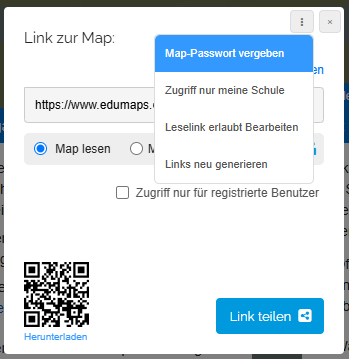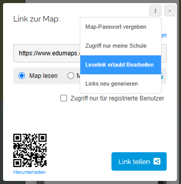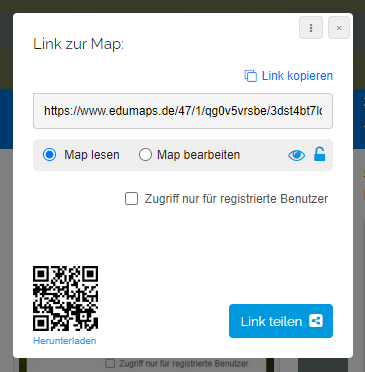 Hier können Sie „Map lesen“ oder „Map bearbeiten“ auswählen. Auch können Sie festlegen, ob die Besucher Ihrer Map bei Edumaps registriert sein müssen.