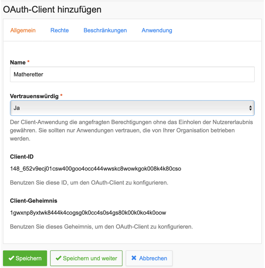 Tab „Anwendung“ anklicken und „WeiterleitungsURLs“ hinzufügenhttps://www.matheretter.de/sso/iserv(muss Ihrem Server entsprechen, also stattwwwdann z. B.heodernrwoderndssetzen). Danach speichern. -