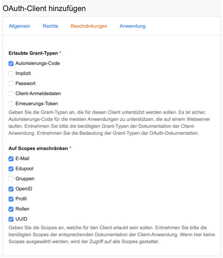 Tab „Beschränkungen“ anklicken und dort Scopes aktivieren. -