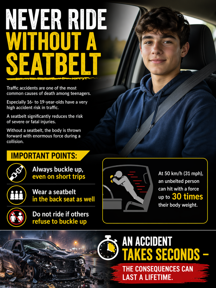 Traffic accidents are one of the most common causes of death among teenagers. Especially 16- to 19-year-olds have a very high accident risk in traffic. A seatbelt significantly reduces the risk of severe or fatal injuries. Without a seatbelt, the body is thrown forward with enormous force during a collision.