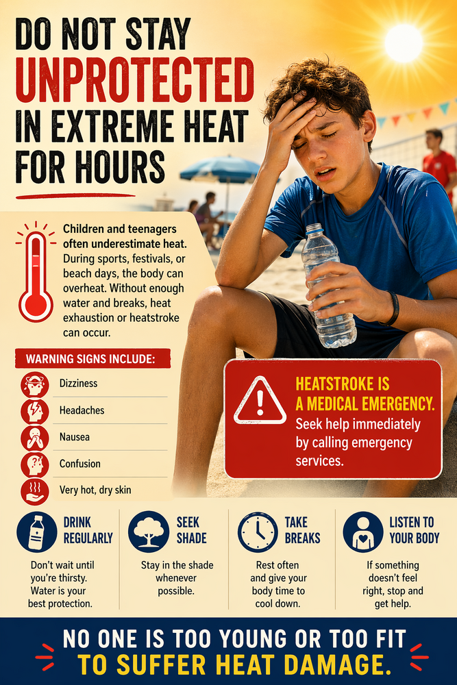 Children and teenagers often underestimate heat. During sports, festivals, or beach days, the body can overheat. Without enough water and breaks, heat exhaustion or heatstroke can occur.