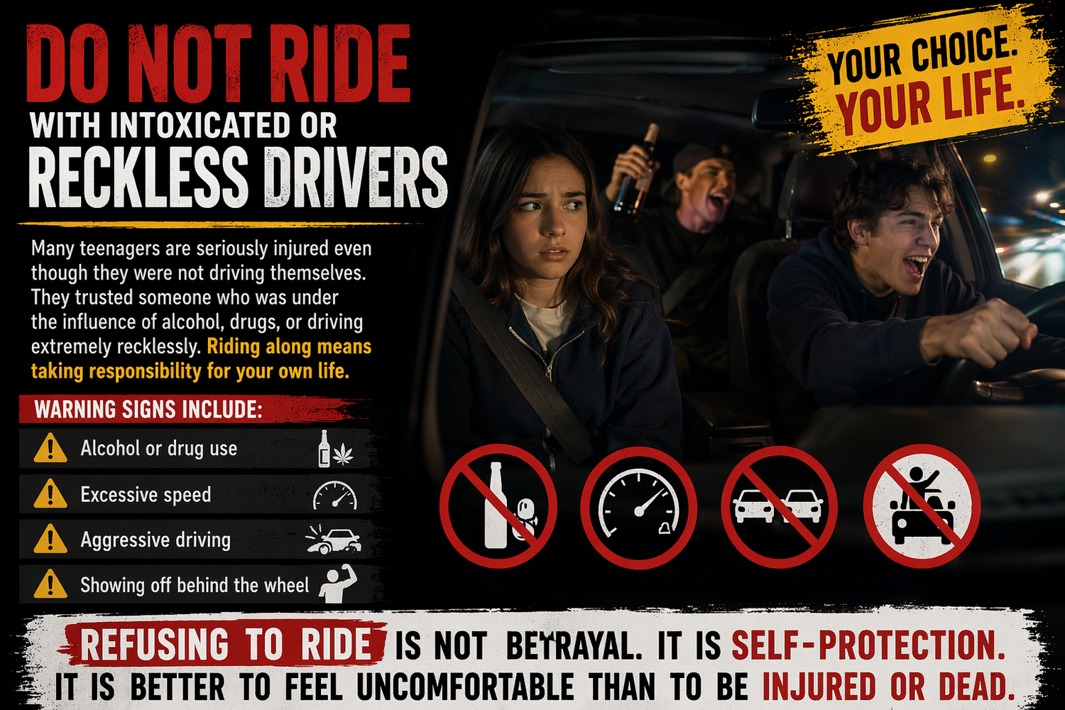 Many teenagers are seriously injured even though they were not driving themselves. They trusted someone who was under the influence of alcohol, drugs, or driving extremely recklessly. Riding along means taking responsibility for your own life.