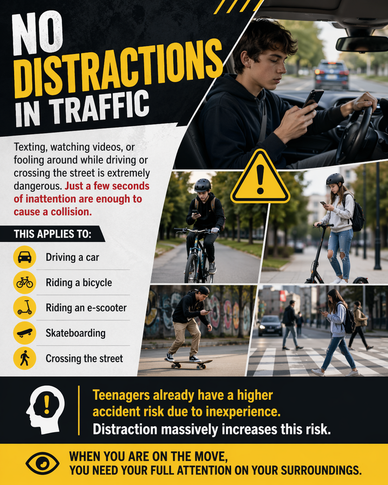 Teenagers already have a higher accident risk due to inexperience. Distraction massively increases this risk. When you are on the move, you need your full attention on your surroundings.