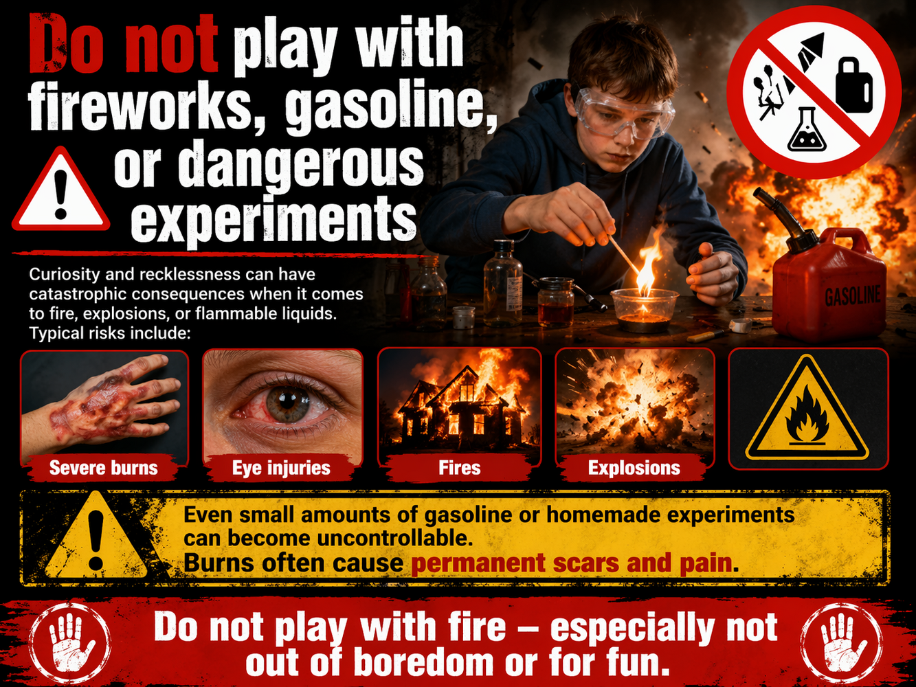 Even small amounts of gasoline or homemade experiments can become uncontrollable. Burns often cause permanent scars and pain. Do not play with fire – especially not out of boredom or for fun.