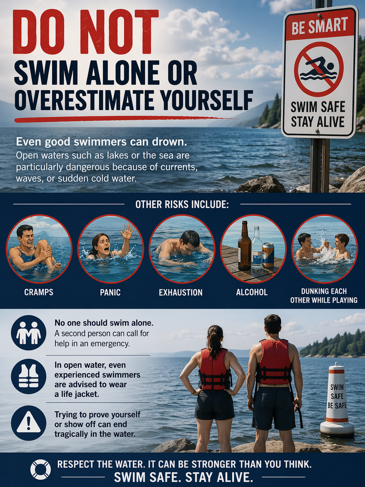 No one should swim alone. A second person can call for help in an emergency. In open water, even experienced swimmers are advised to wear a life jacket. Trying to prove yourself or show off can end tragically in the water.