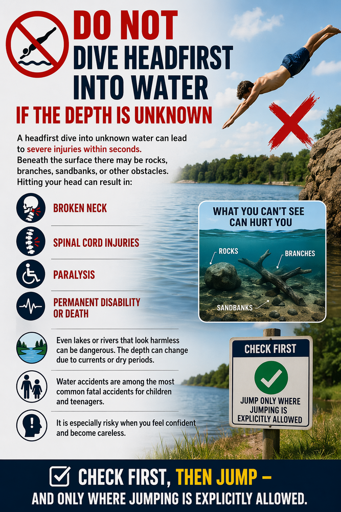 A headfirst dive into unknown water can lead to severe injuries within seconds. Beneath the surface there may be rocks, branches, sandbanks, or other obstacles. Hitting your head can result in: