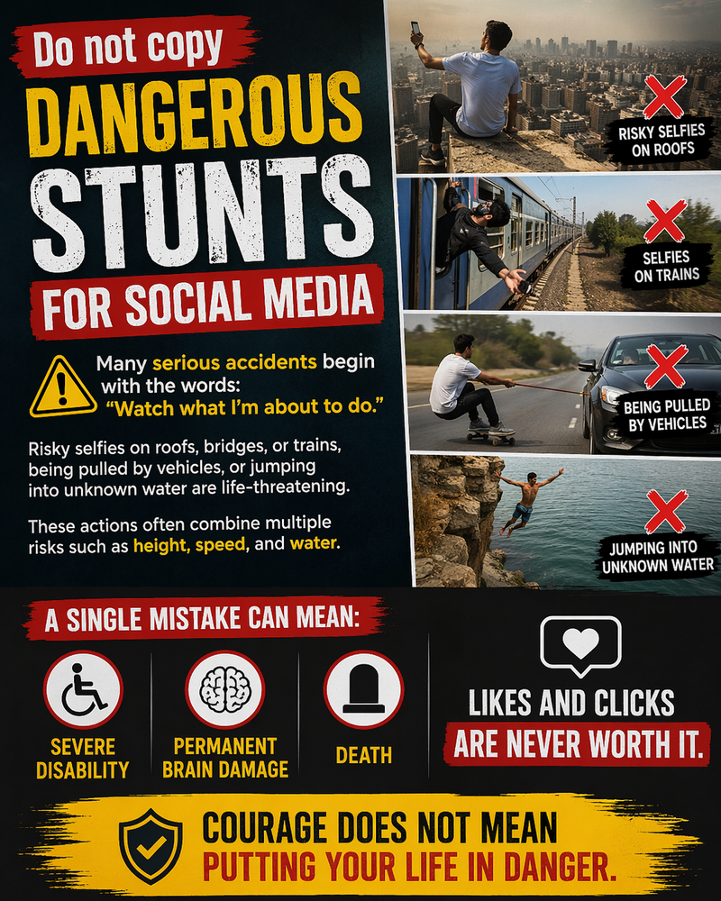 Many serious accidents begin with the words: "Watch what I’m about to do." Risky selfies on roofs, bridges, or trains, being pulled by vehicles, or jumping into unknown water are life-threatening. These actions often combine multiple risks such as height, speed, and water.