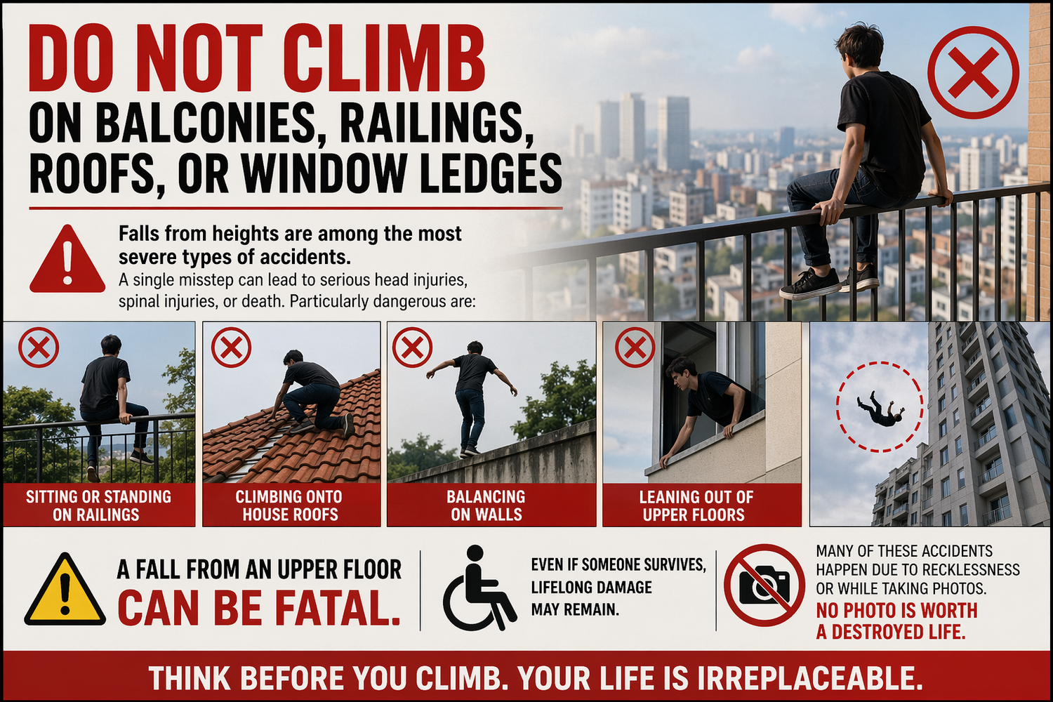 - 🏢 Do not climb on balconies, railings, roofs, or window ledges