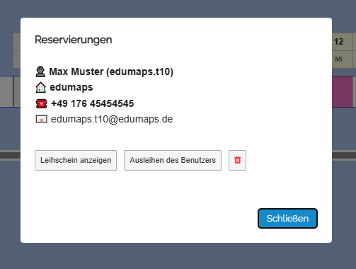 Rufen Sie die „Timeline“ der Reservierungen auf, so können Sie einfach auf einen Termin klicken und Sie sehen alle wesentlichen Kontaktdaten des Entleihers.