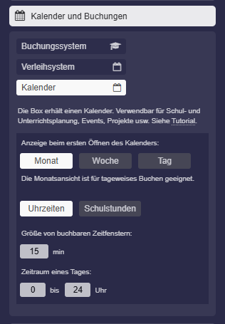 - Für jede Box kann ein separater Kalender aktiviert werden.