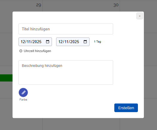 Ändern Sie die Zeiten nach Belieben. Fügen Sie den Titel und optional eine Beschreibung hinzu. Wählen Sie optional eine Farbe aus.