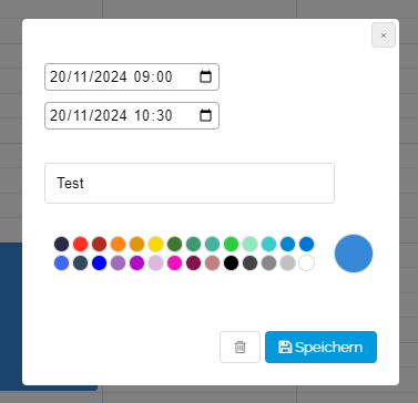 Termine können Sie löschen, indem Sie direkt auf den Termin klicken und das Lösch-Icon neben dem Speichern-Button wählen.