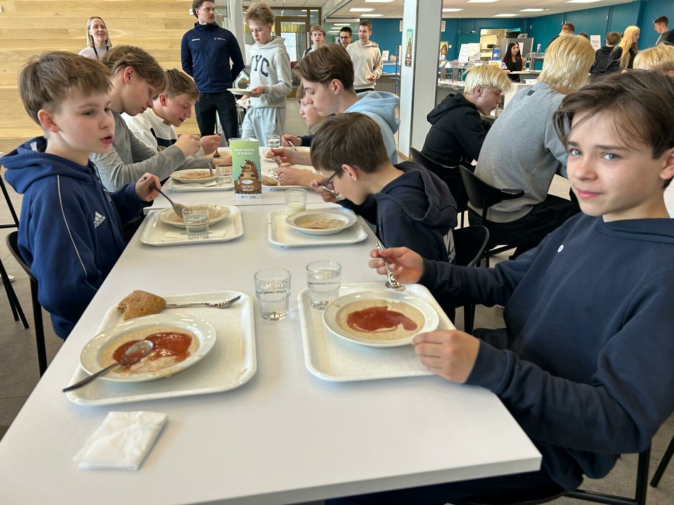 Zum Mittagessen gab es Haferbrei mit Erdbeersoße sowie Brot mit Butter. Danach nahmen wir am Geschichtsunterricht der 8. Klasse teil, in dem wir uns mit dem Thema DDR und BRD beschäftigten und interessante Einblicke in die deutsche Vergangenheit aus finniach-deutscher Perspektive erhielten.