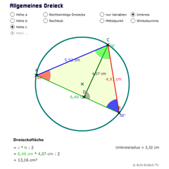 Mit diesem Programm könnt ihr ein allgemeines Dreieck festlegen und erhaltet die Höhe, die Winkel, die Fläche und den Umkreis mit Umkreisradius berechnet.