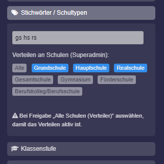 2. Scrollen Sie ganz nach unten, dort finden Sie die Stichwörter. Mit Hilfe der Stichwörter können Sie bestimmen, ob alle Ihre Schulen die Map sehen sollen oder nur bestimmte Schultypen.