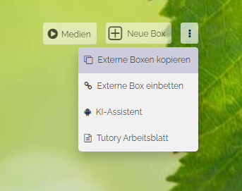 Um externe Boxen von anderen Maps zu kopieren, klicken Sie auf die drei Punkte rechts neben dem Button „Neue Box“. Daraufhin öffnet sich ein Dropdown. Wählen Sie dort „Externe Boxen kopieren“.