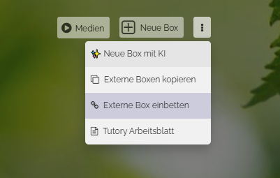 Um eine externe Box von einer anderen Map einzubetten, klicken Sie auf die drei Punkte rechts neben dem Button „Neue Box“. Daraufhin öffnet sich ein Dropdown. Wählen Sie dort „Externe Box einbetten“.