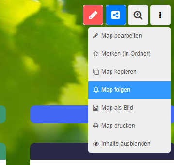 Um Benachrichtigungen über neue Boxen auf einer Map zu erhalten, können Sie einer Map folgen. Hierzu klicken Sie in der Map-Ansicht rechts oben auf die drei Punkte und wählen im Dropdown „Map folgen“. Nun erhalten Sie Benachrichtigungen direkt auf Edumaps über die gelbe Glocke im Hauptmenü. Zudem prüft unser Server einmal am Tag, welche Benutzer über neue Inhalte informiert werden sollen und sendet entsprechende E-Mails.