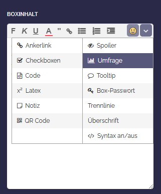 Hierzu öffnen Sie den Box-Editor, klicken auf das Dropdown und wählen „Umfrage“.