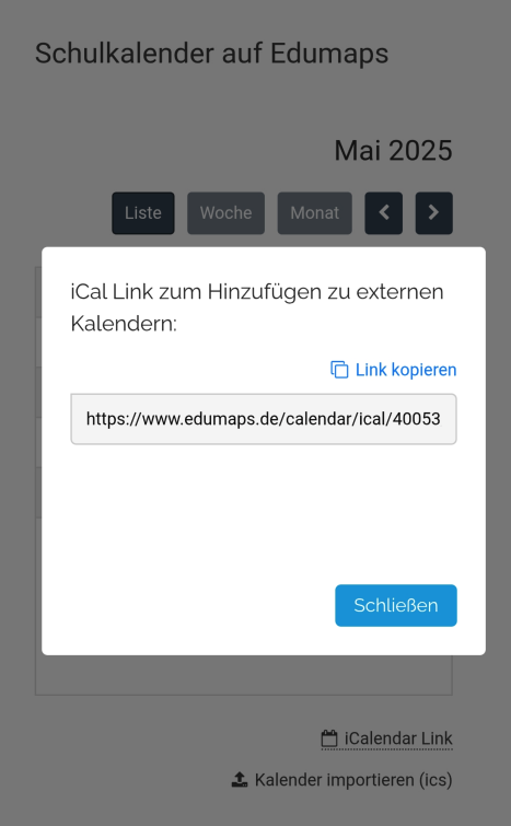 Rechts unterhalb des Kalenders findet sich ein Link „iCalendar Link“. Klicken Sie darauf, so öffnet sich ein Dialog mit diesem Link: