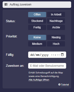 Wenn ein Auftrag an einen anderen Benutzer zugewiesen wurde, so sollte dieser Benutzer nach Fertigstellung den Status auf „Fertig“ setzen. Dadurch erhält der Mapbesitzer/Auftraggeber eine Benachrichtigung.
