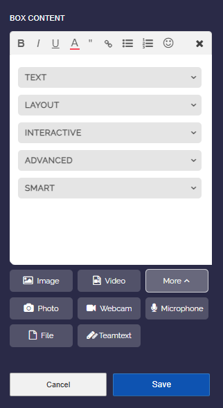 Editor Bar If you are working the first time with the editor, then the editor bar will help you to format the text. Editor Bar Also note the other modules in the editor “More” dropdown. Modules in Editor with Click on “More” 0