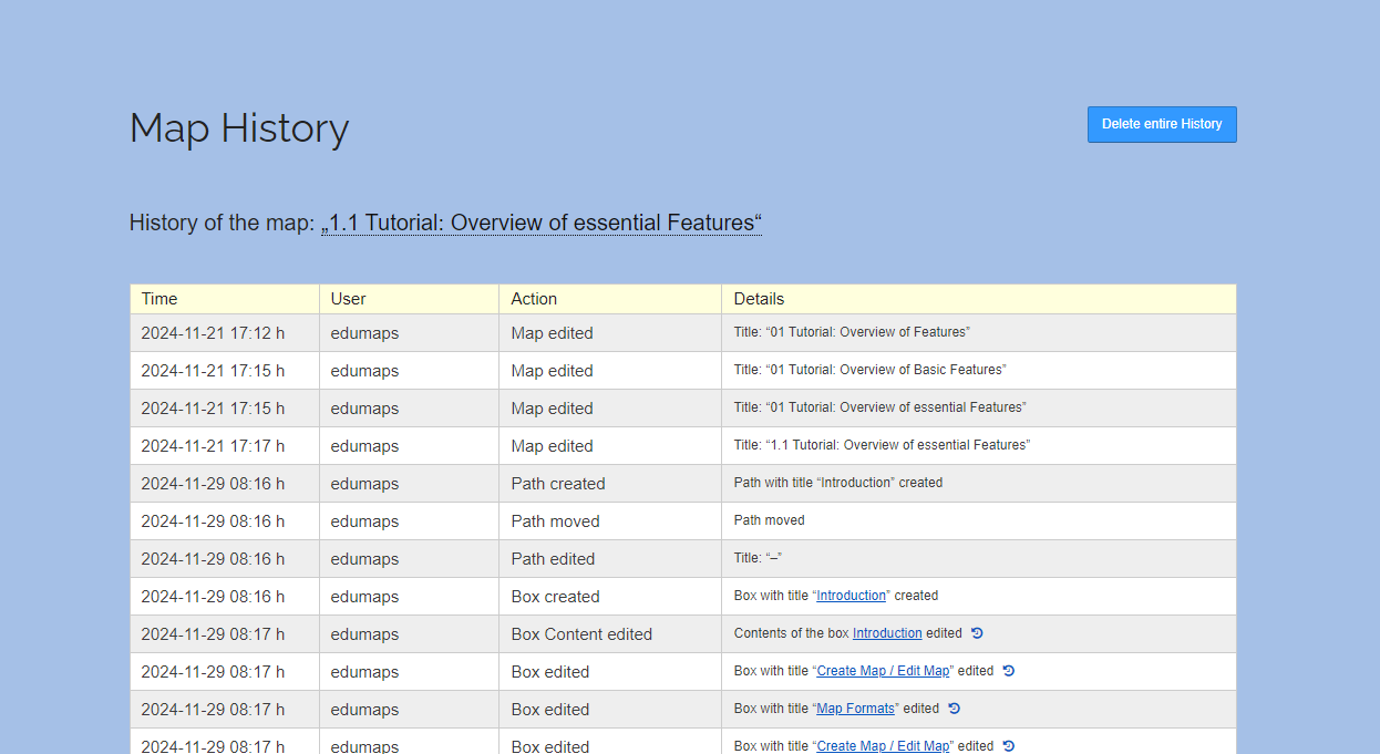 For each map it is recorded which user made which changes. In the so-called “Map History” you can view all changes and see who has contributed to your map.