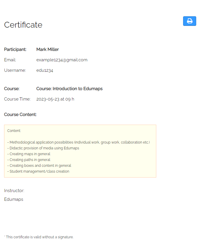 When a course is finished, each participant automatically receives an email with the certificate of participation.