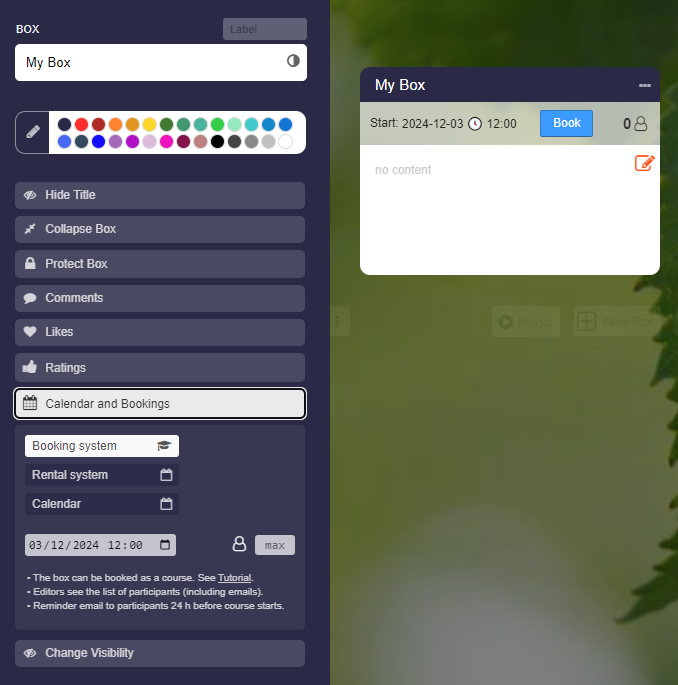 - “Booking System” - The box can be booked as a course.
