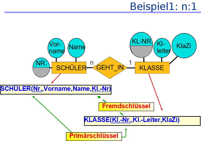 Für die Verbindung von zwei Relationen für Entities in einer 1:n-Relationship werden sogenannte Fremdschlüssel (Foreign Keys) benötigt. Diese sind die Primärschlüssel der Relation mit der Kardinalität 1 und werden in der Relation mit der Kardinalität n eingetragen (siehe 5).
